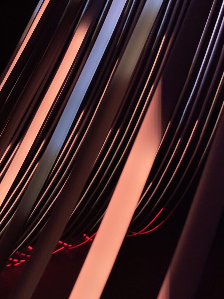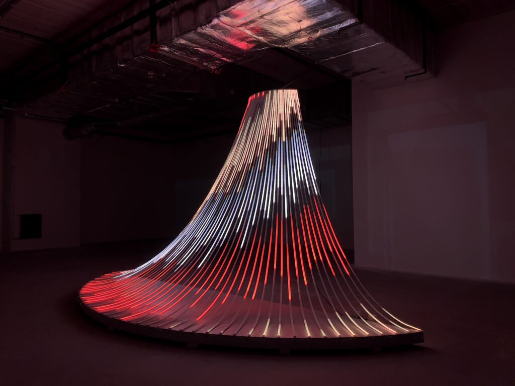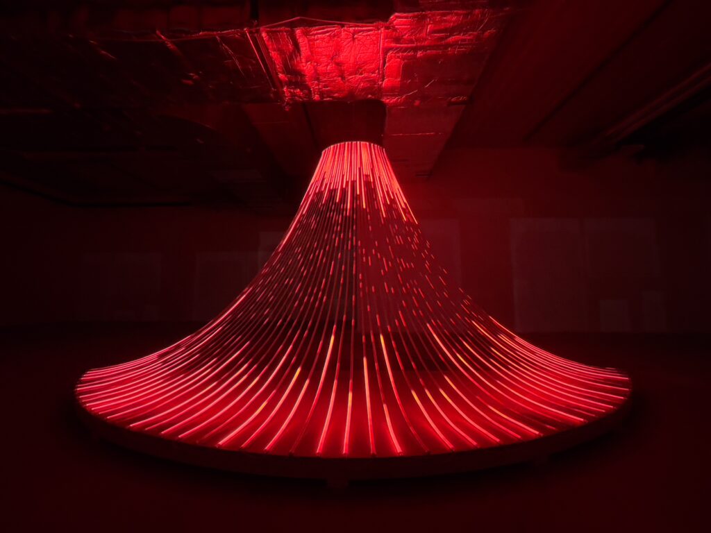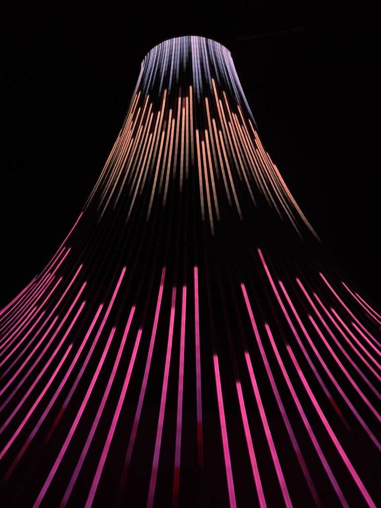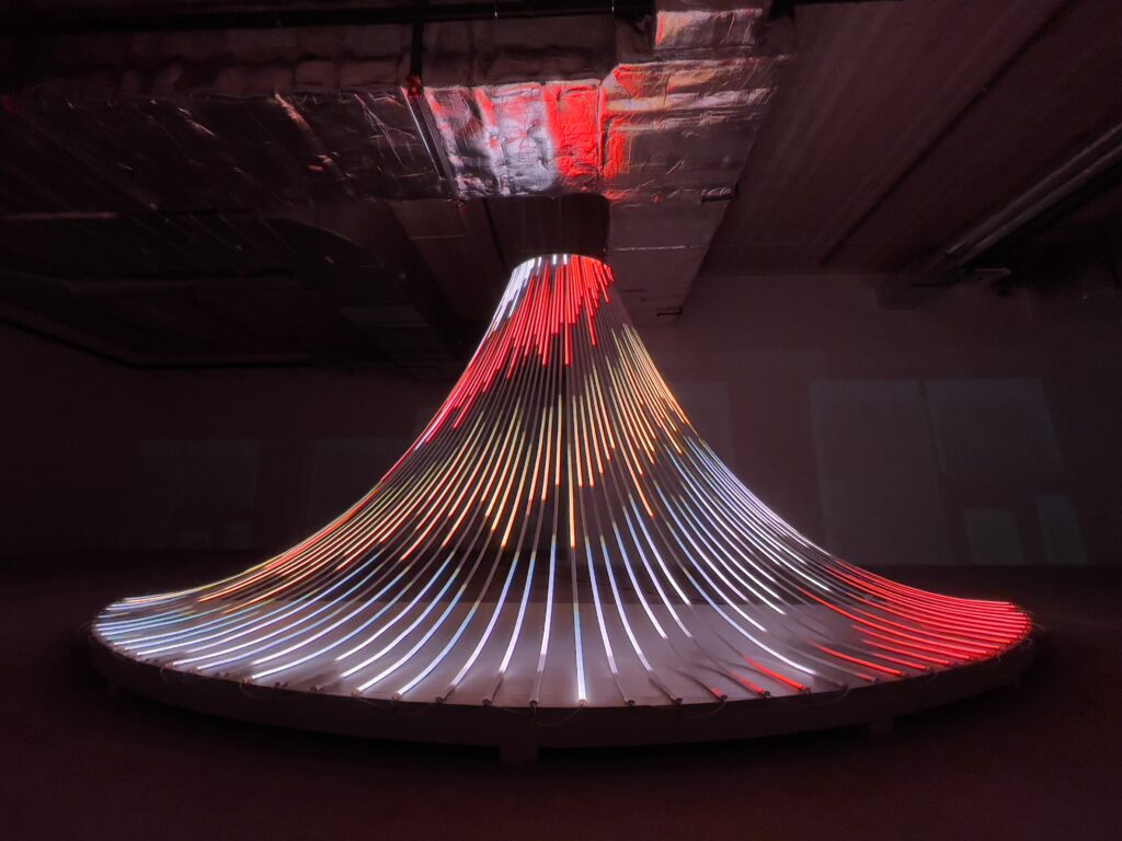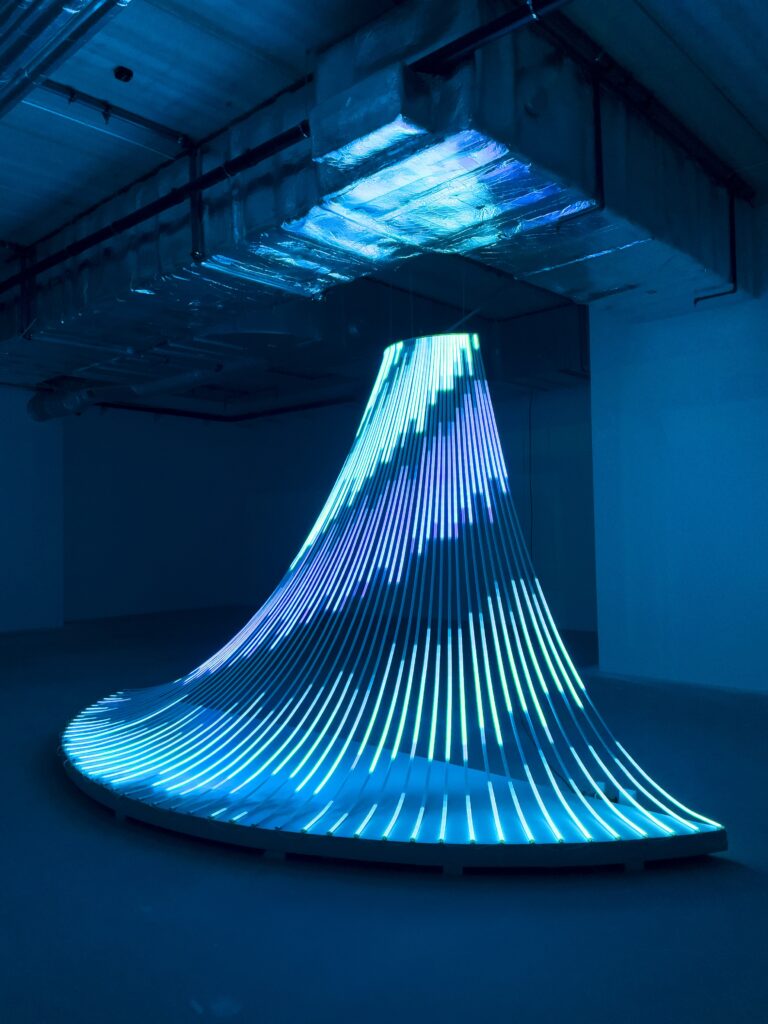 The artwork consists of 50 LED strips, each five meters long, suspended from the ceiling in a circular formation. Each strip is individually programmed to display light sequences thatone-third move between the floor and ceiling. The flowing light patterns represent the invisible streams that run through a building – electricity, data, air, water – and the human activity connecting them.